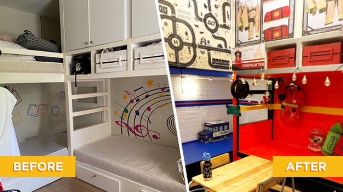 Hiểu được sở thích của con trai nên chị Kim lùng sục khắp các trang bán hàng online để tìm kiếm mọi thứ liên quan đến xe cứu hỏa. Jaime bị hen suyễn nên chị không muốn sơn lại tường. Chị khắc phục bằng việc dán giấy dán tường và sử dụng băng keo.