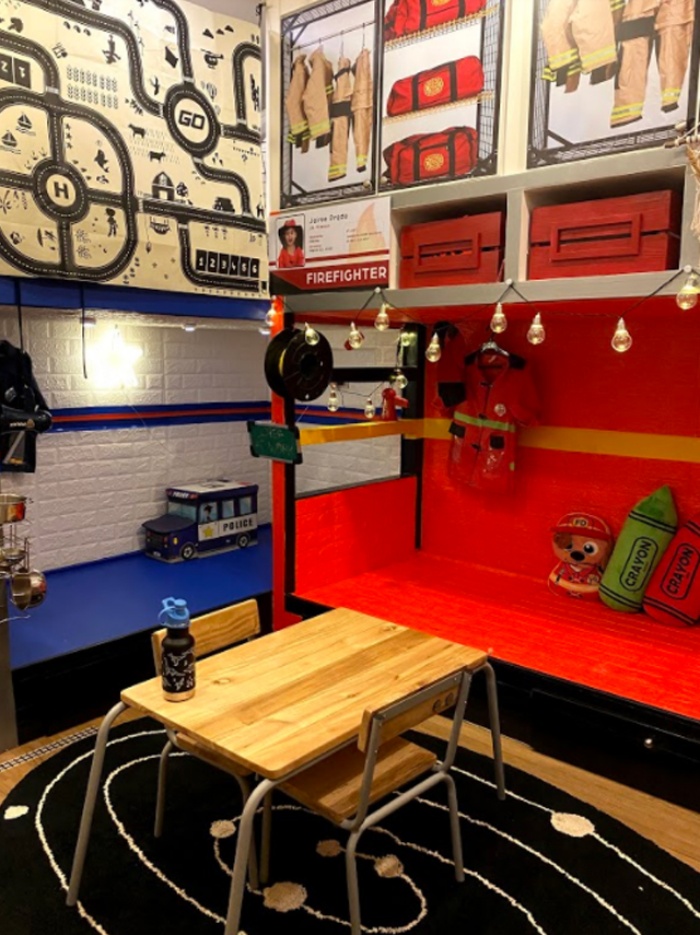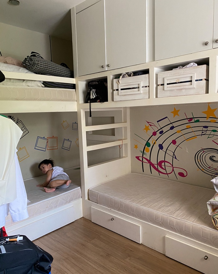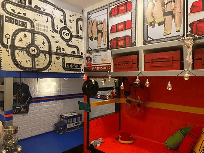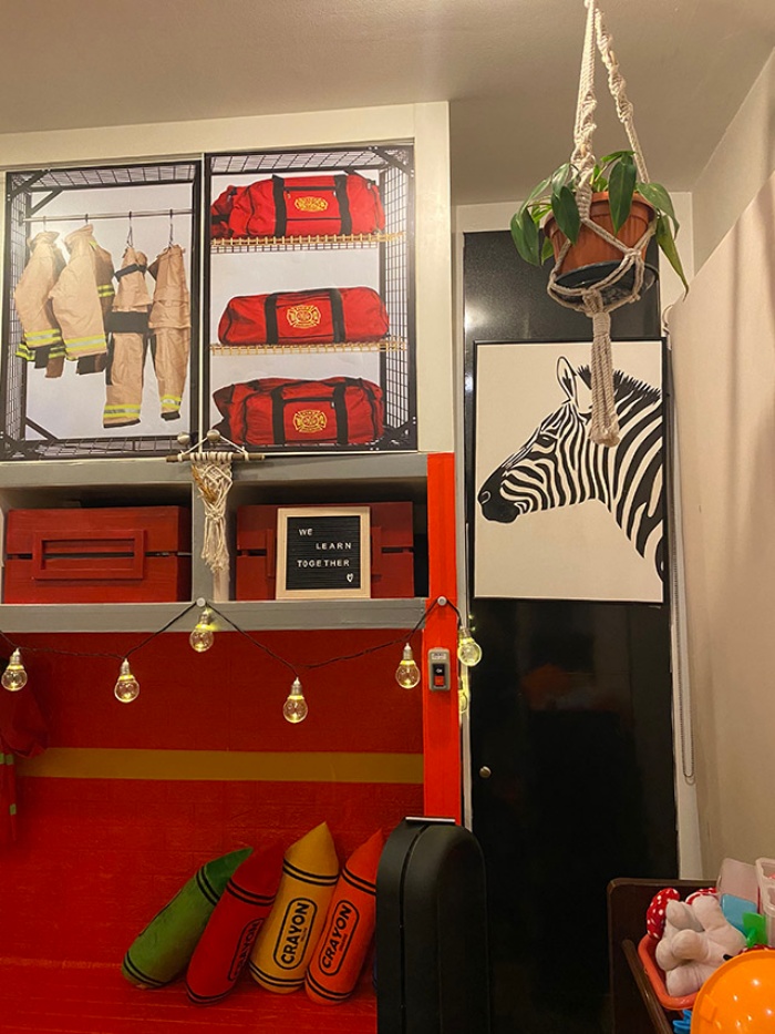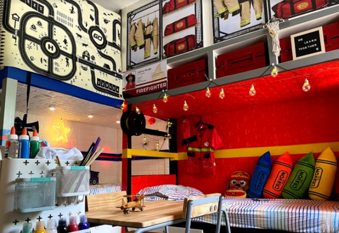 Bên cạnh việc dán tường, chị cũng phủ các ngăn tủ bằng các bản in trang phục và túi của lính cứu hỏa.. Các hộp lưu trữ cũng được che bằng băng keo để phù hợp với chủ đề. Ở phía bên trái, chị Kim còn mua một tấm bản đồ để che đi chiếc giường tầng trên cùng, nơi mọi người có thể cất trữ đồ đạc khi cần.